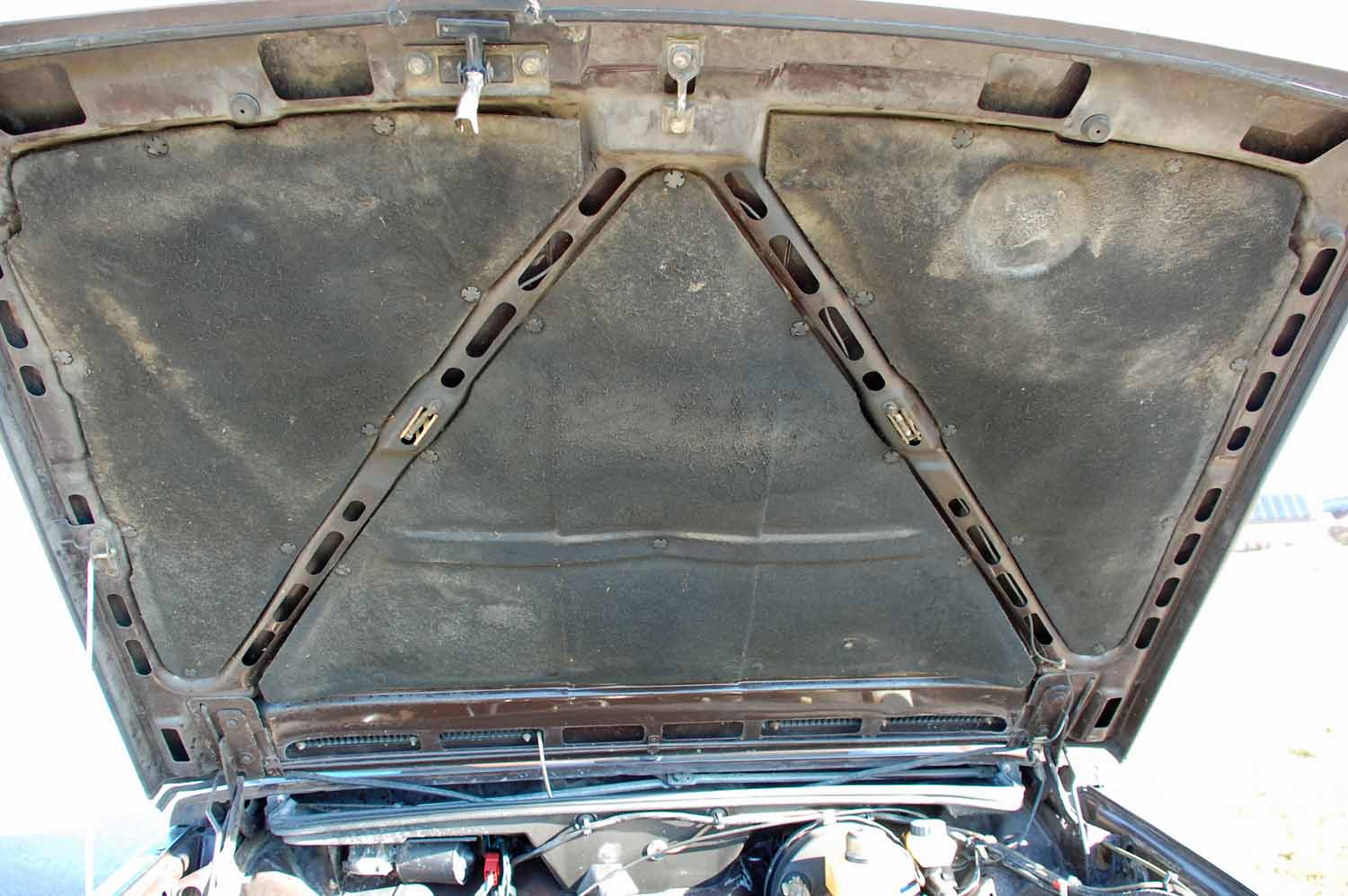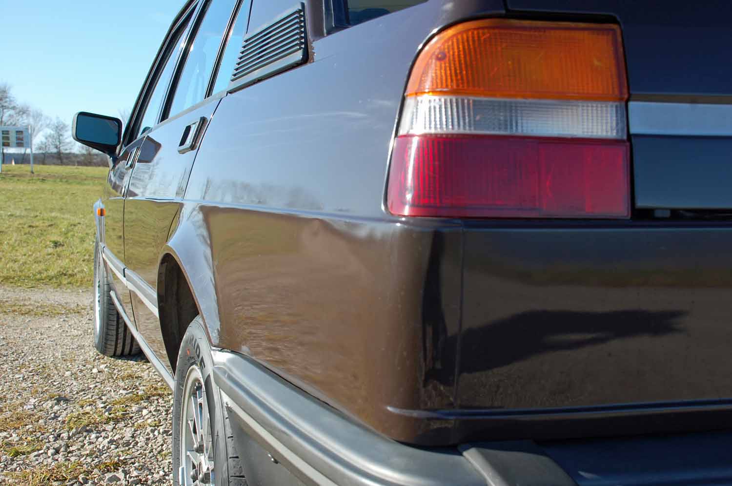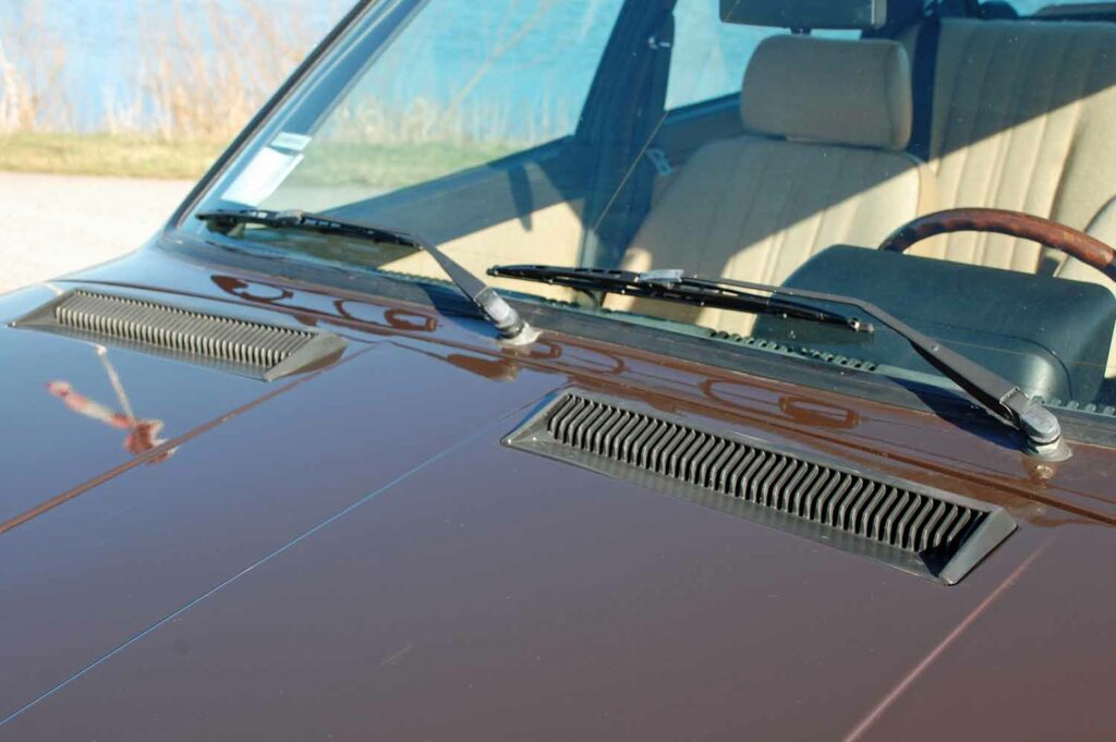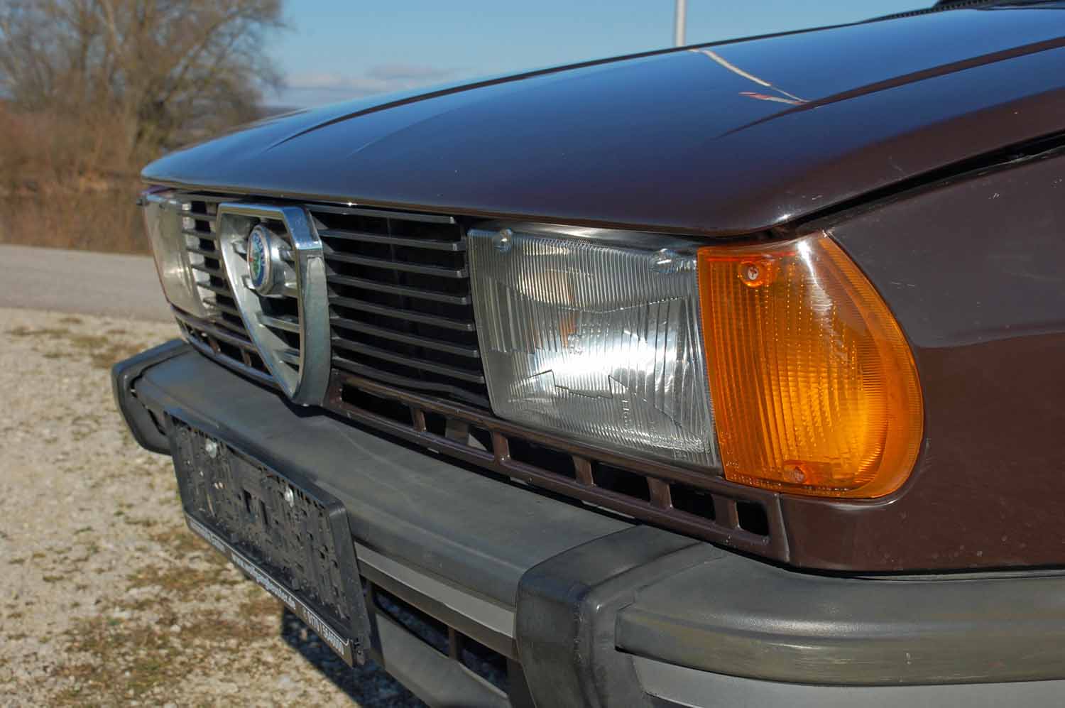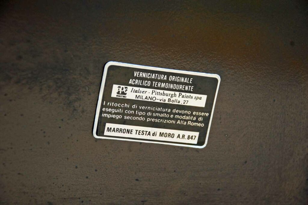 Unsere Giulietta ist in der originalen Farbe „Marrone Testa di Moro“ lackiert. Der Alfa ist weitgehend nachlackierungsfrei, deshalb sind nach über 40 Jahren diverse Lackmängel zu beklagen. Rostschäden oder gar Durchrostungen sucht man aber vergeblich. Weder am Unterboden noch an den Türen und Hauben hat die braune Pest gewütet. Lediglich an einer kleinen, aber für die Giulietta leider typische Stelle fängt es etwas an zu blühen, der Scheibenrahmen vorne sollte im Auge behalten werden, dringender Handlungsbedarf besteht nicht.