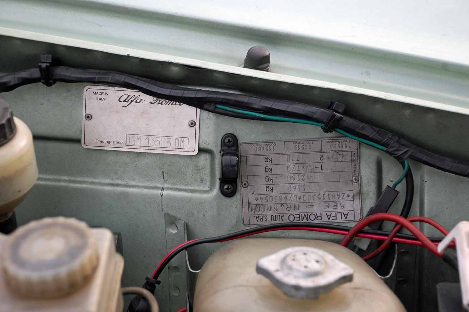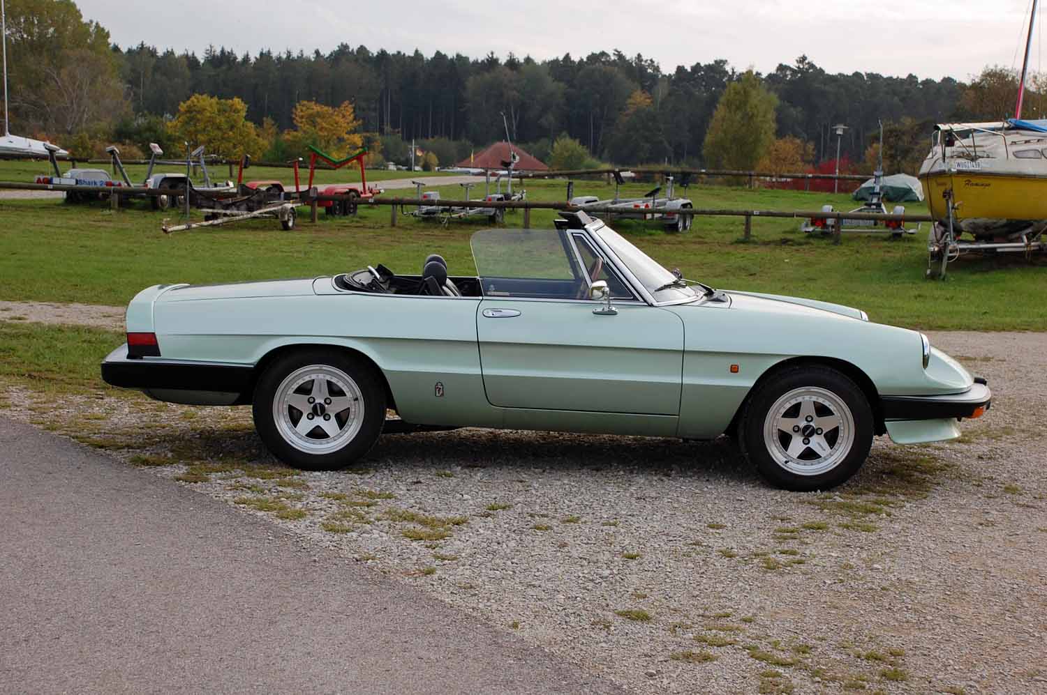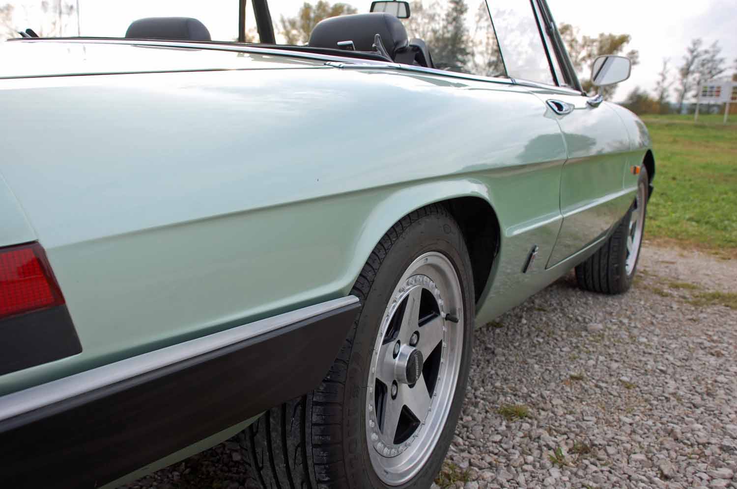 Auch die Felgen unseres Exemplars sind von Zender in der Größe 7x15Zoll. In der originalen Farbe Türkis Metallic macht er in Verbindung mit den polierten Felgen einen sehr edlen Eindruck. Überhaupt wurde an diesem Spider nicht gespart. Das originale Holzlenkrad ist genauso noch vorbaut wie die schwarzen Kunstledersitze. Alles nachvollziehbar durch das von Alfa Romeo erstellte Originalitätszertifikat. Gebaut worden ist dieser Alfa am 28 März 1985, er stand dann bis April 1986 bei einem deutschen Vertragshändler zum Verkauf. Unser Spider hatte Glück, zeit seines Autolebens wurde er noch nie im Winter auf salzigen Straßen bewegt.