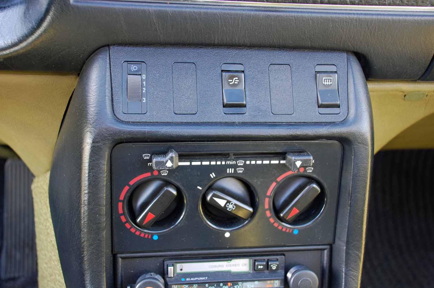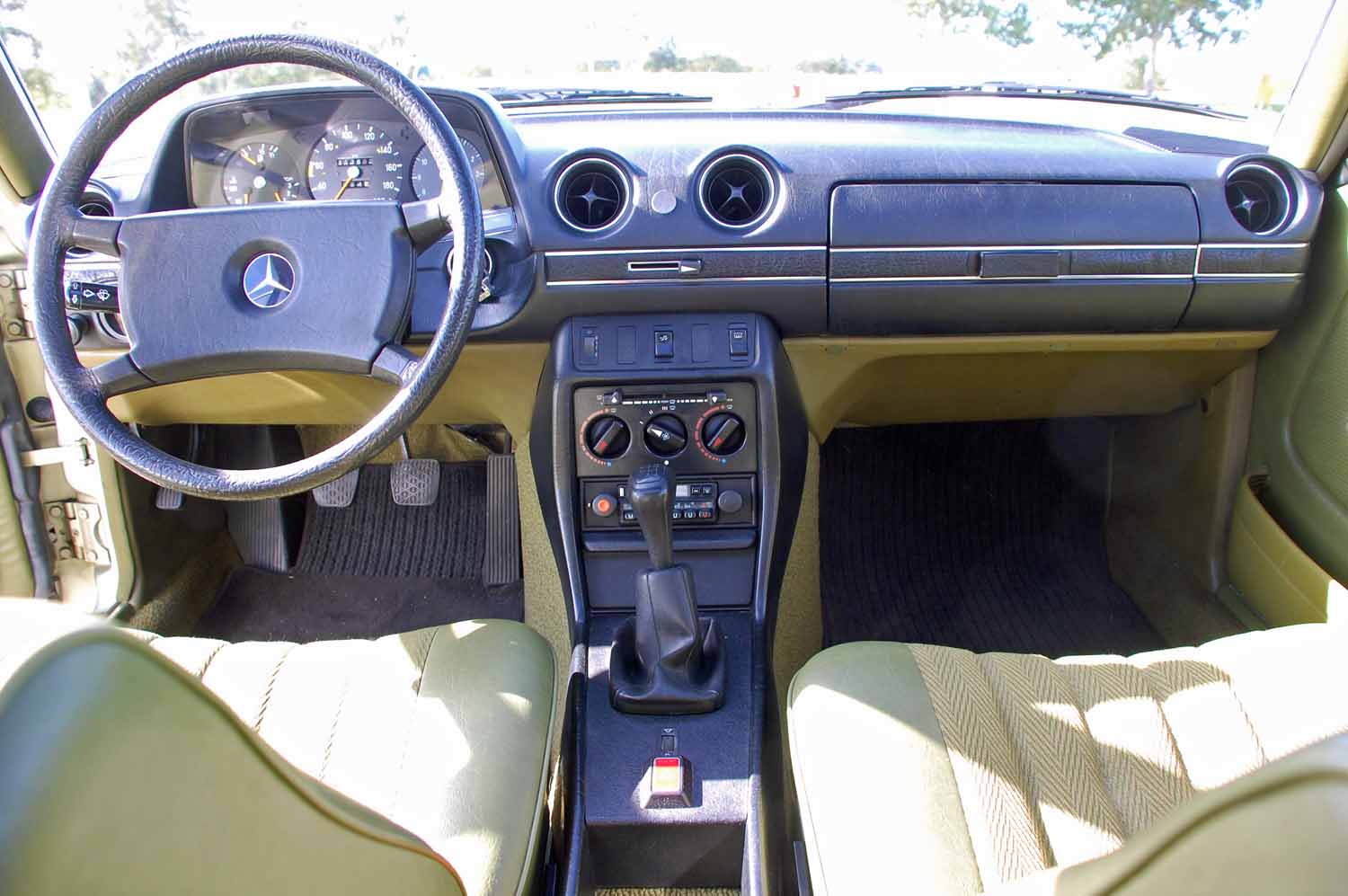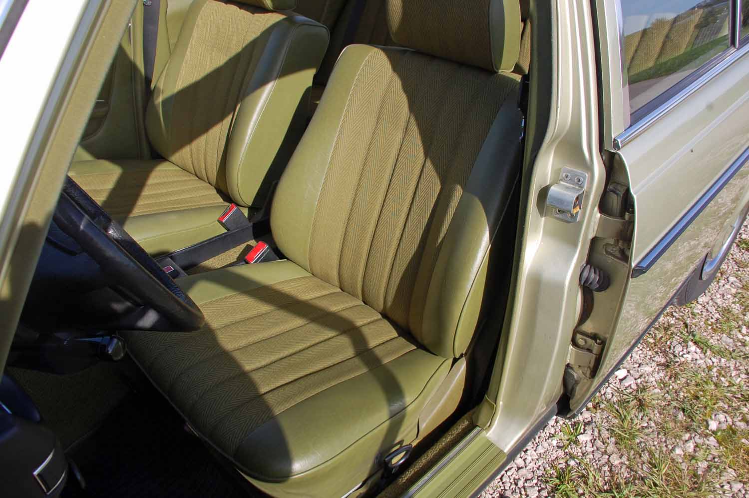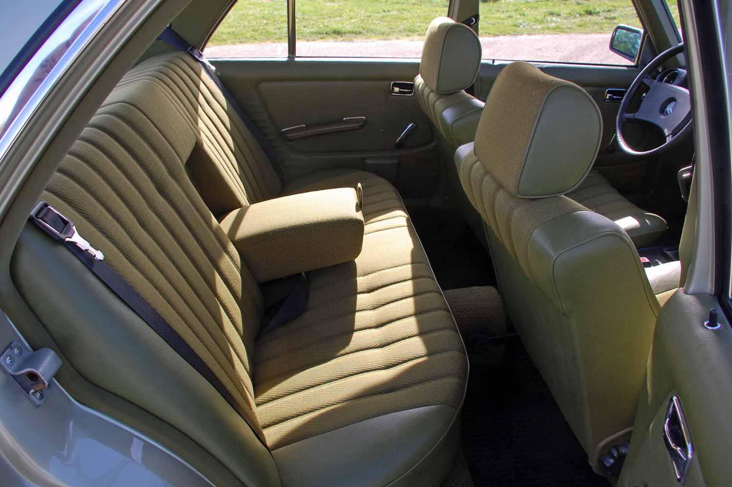 Ein ganz besonders schönes Highlight ist die Innenausstattung. Ich konnte keinerlei Beschädigungen finden. Weder aufgescheuerte Sitze noch ein gerissenes Armaturenbrett. Der Blaupunkt Radio funktioniert genau so gut wie das elektrische Schiebedach. Nicht einmal die Sonnenblenden sind verformt und die Hutablage ist euch nicht ausgeblichen. Der Mercedes muß wohl zeitlebens in der Garage gestanden haben.