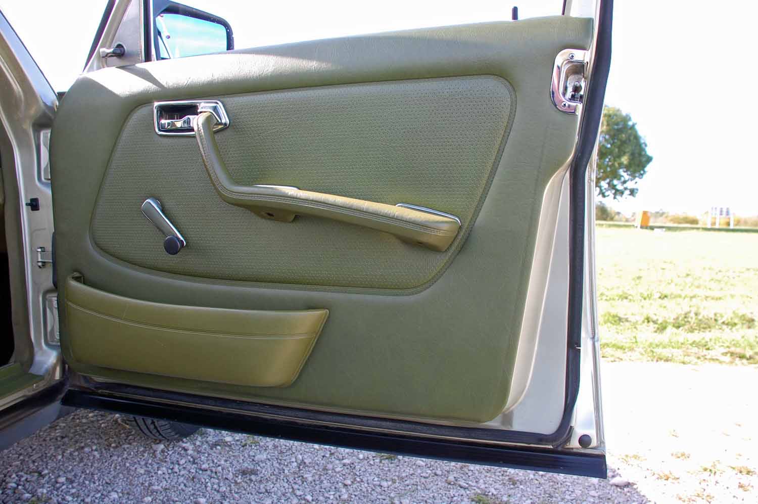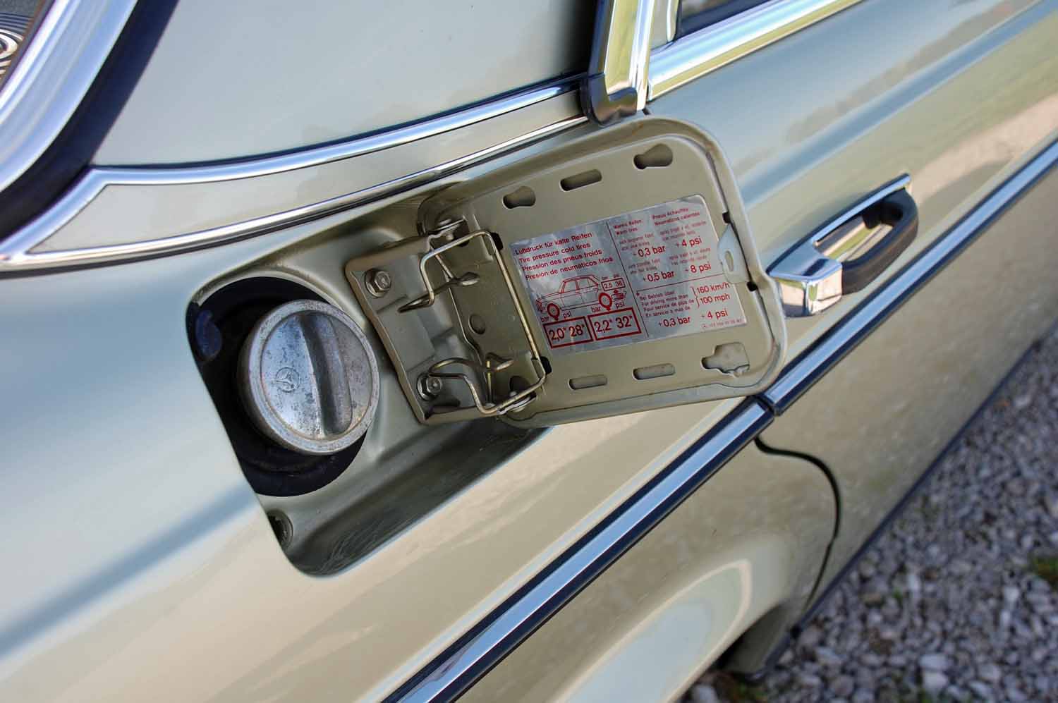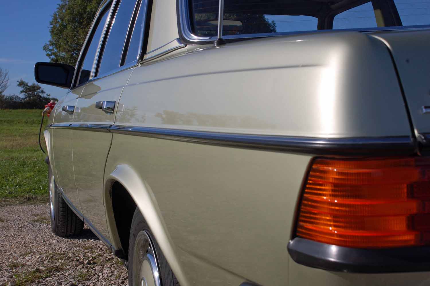 Die niedrige Laufleistung von gerade einmal 113700 km sieht man dem Wagen überall an. Alle Zierleisten sind vorhanden und in sehr gutem Zustand. Die Türen weißen keine Rostschäden auf, die Kotflügel wurden schon erneuert und sind somit auch ohne Rostbefall. Der Wagen wurden irgendwann einmal komplett von einem Profi lackiert, es sind keine Dellen oder Kratzer vorhanden. Die Beleuchtung weißt auch keine Schäden auf, alles ist so wie man es sich wünscht. Zu dem Mercedes wurde im Jahre 2016 ein Classic Data Wertgutachten erstellt mit der Zustandsnote 2+.