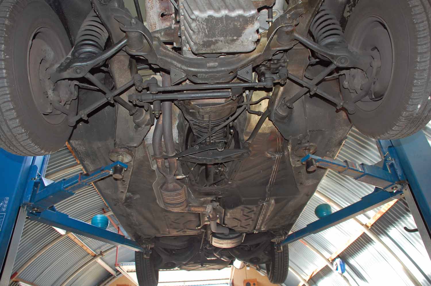 Auch von unten macht der über 40 Jahre alte Benz einen soliden Eindruck. Alle Hohlräume wurden sorgfältig konserviert, die Brems- und Kraftstoffleitungen sind neuwertig. Es sind keinerlei arbeiten nötig, reinsetzen und losfahren. Viele Verschleißteile wurden schon erneuert, zum Beispiel ist erst ein neuer originaler Auspuff eingebaut worden.