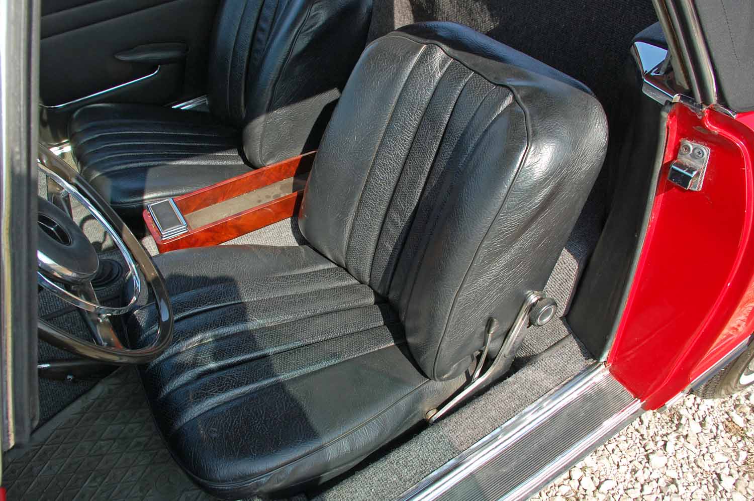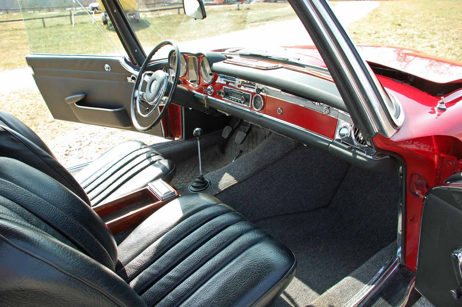 Wie Original ausgeliefert, besitzt die Pagode Sitze in schwarzen MB-Tex Kunstleder. Die Sitzbezüge sind noch Original, den Teppich haben wir beim Sattler erneuern lassen. Der Tacho wurde schon vom Vorbesitzer auf deutsche Skala umgerüstete, Temperatur und Öldruck ist noch in den amerikanischen Einheiten. Das Becker Radio funktioniert einwandfrei. Das Holz wurde durch Wurzelholz ersetzt, der Rest des Armaturenbretts ist neu überzogen. Die Türverkleidungen sind noch Original.