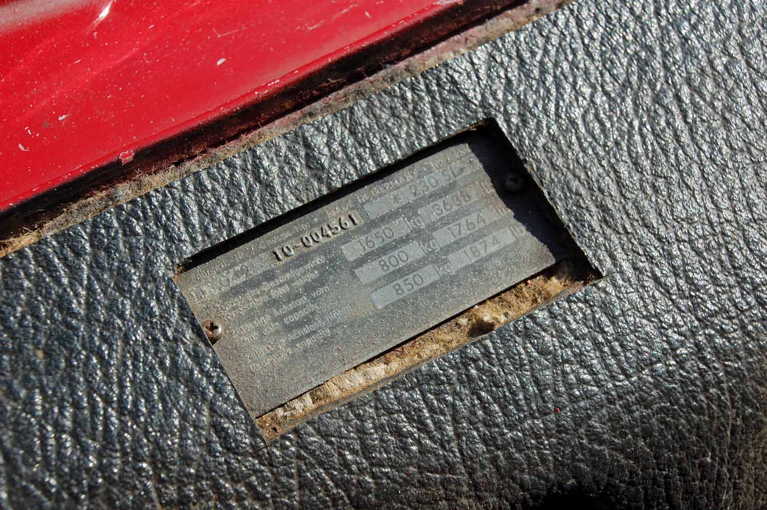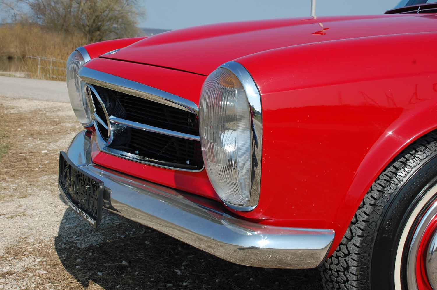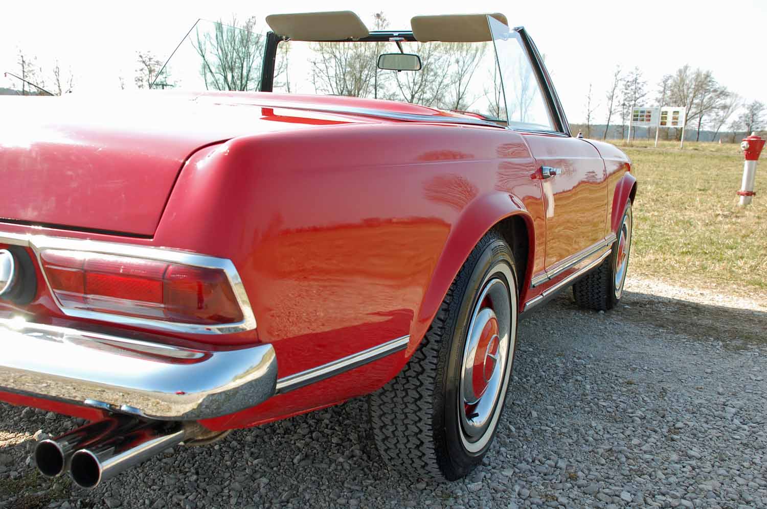 Hier haben wir ein frühes Modell, dass am 24. Juni 1965 das Band in Stuttgart verlassen hat. Das Datum ist aus der vorhandenen Datenkarte ersichtlich. Der SL ist in USA-Florida gelaufen, was den guten Zustand der Karosserie erklärt. Natürlich sind auch an diesem Auto die fast 60 Jahre nicht spurlos vorüber gegangen. Der Außenlack wurde schon einmal in den USA erneuert, zum Glück im Original Farbton 568 Signalrot.