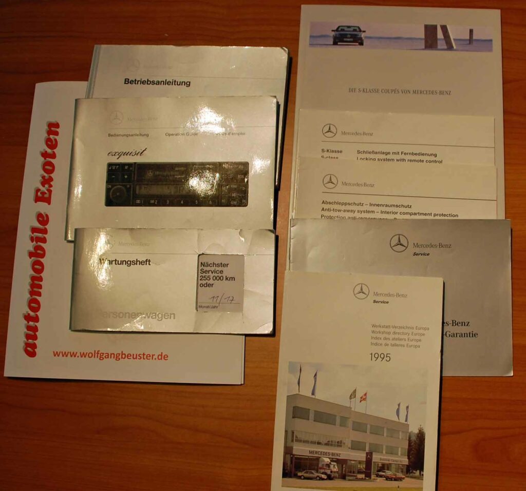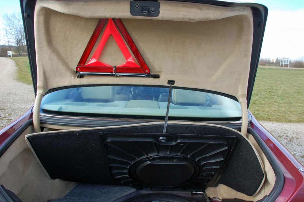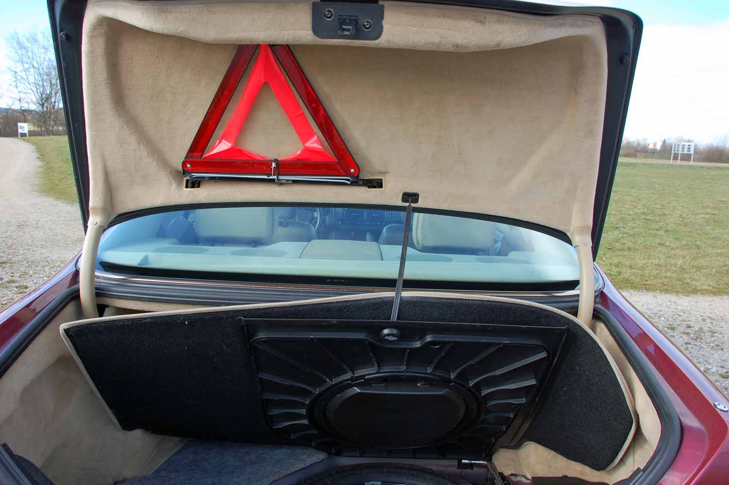 Im Kofferraum sieht alles sauber aus, Warndreieck und Werkzeug sind vorhanden. Alle Bücher sind dabei und das Scheckheft ist geführt, wenn auch nicht immer bei Mercedes. Außerdem ist eine Mappe mit alten Rechnungen und TüV-Berichten vorhanden. Daraus geht eine Umrüstung auf die Schadstoffklasse Euro2 hervor. Es wurde auch ein neuer Motorkabelbaum eingebaut, eine leidige Krankheit bei Mercedes Modellen dieser Bauzeit.