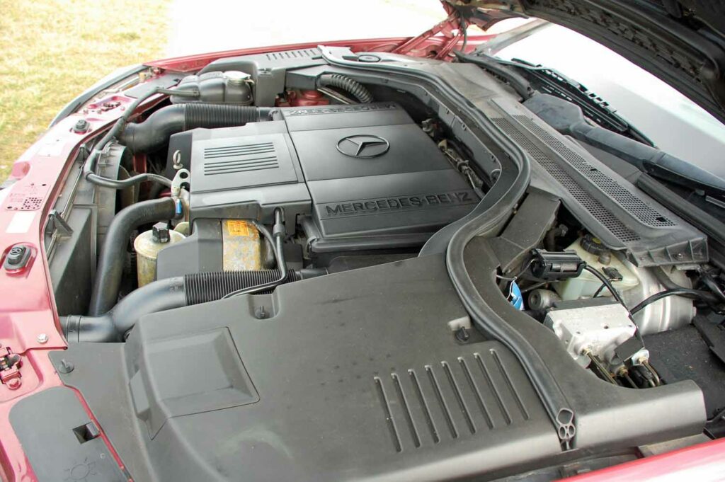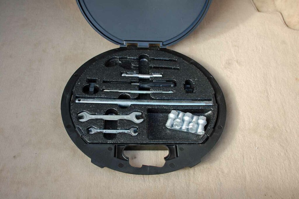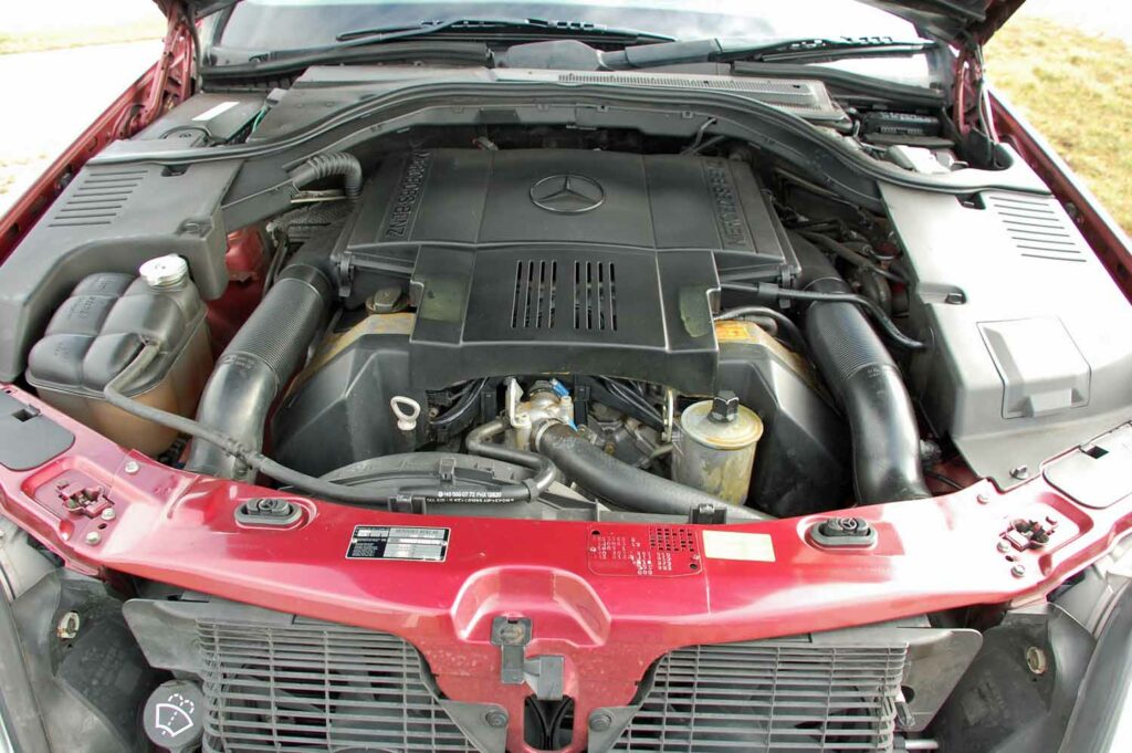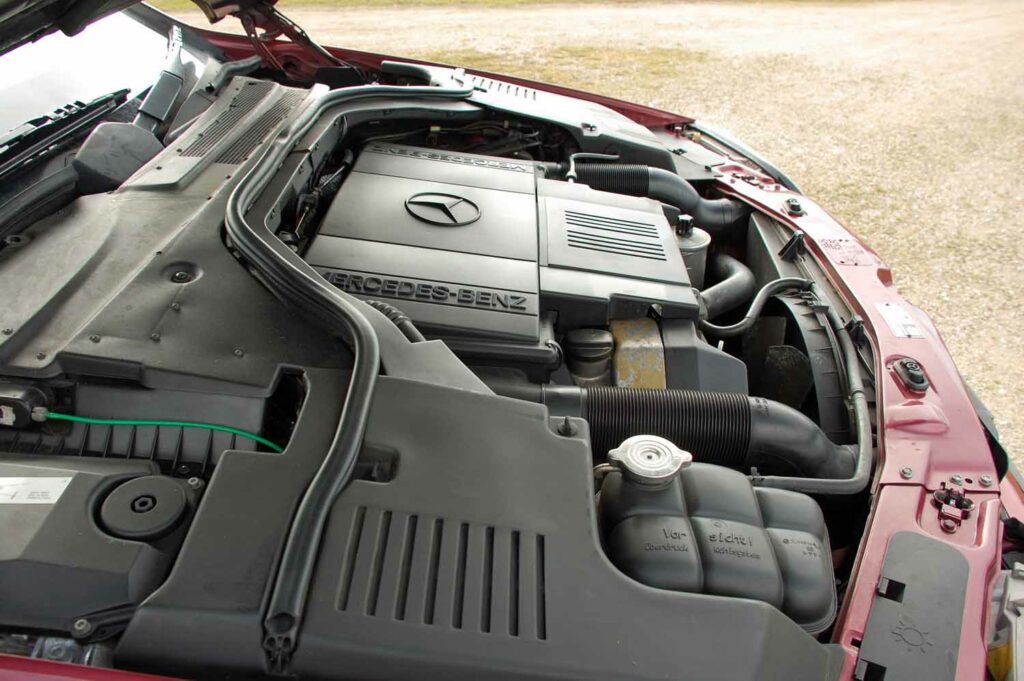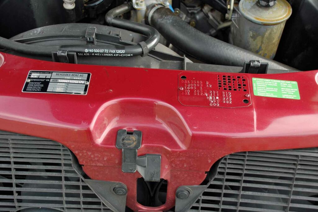 Im Kofferraum sieht alles sauber aus, Warndreieck und Werkzeug sind vorhanden. Alle Bücher sind dabei und das Scheckheft ist geführt, wenn auch nicht immer bei Mercedes. Außerdem ist eine Mappe mit alten Rechnungen und TüV-Berichten vorhanden. Daraus geht eine Umrüstung auf die Schadstoffklasse Euro2 hervor. Es wurde auch ein neuer Motorkabelbaum eingebaut, eine leidige Krankheit bei Mercedes Modellen dieser Bauzeit.