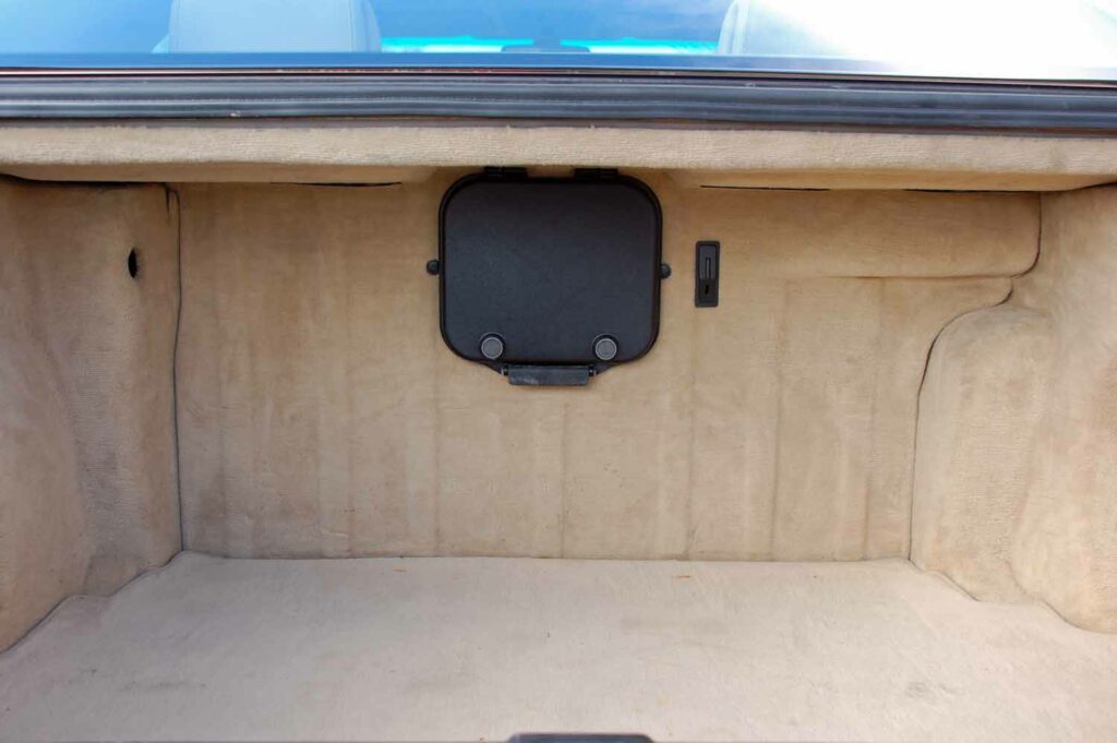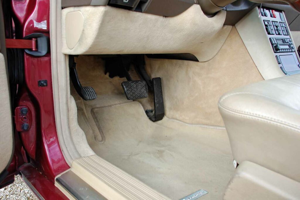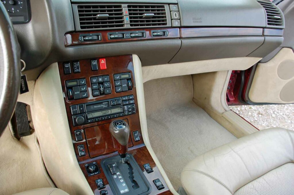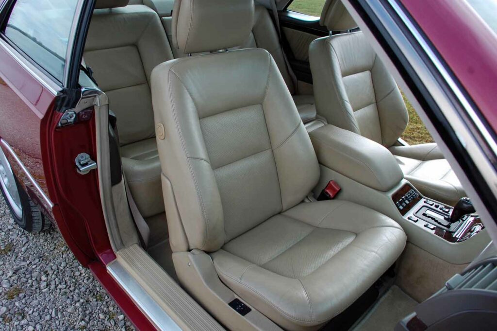 Zum roten Außenlack passt die Beige Lederausstattung natürlich farblich perfekt. Auch hier ist alles in edelsten Materialien gehalten. Sogar die Türöffner sind mit Wurzelnußholz ausgelegt. Besonderes Highlight ist natürlich der seltene Reiserechner, der sich unter einer Klappe im Armaturenbrett versteckt. Die Kopfstützen im Fond sind übrigens einzeln elektrisch auf- und abklappbar.
