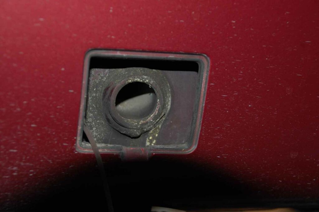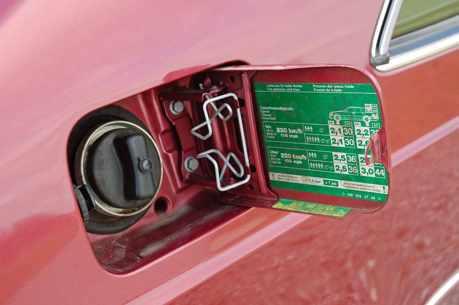 Unser Coupe ist in der für diese Baureihe seltenen Farbe Almandinrot Metallic lackiert. Unfallschäden konnte ich an der Karosserie keine feststellen, wenngleich einige Bauteile schon nachlackiert sind. Das bleibt bei einer Fahrleistung von etwas über 200.000km und einem Alter von fast 30Jahren leider selten aus.