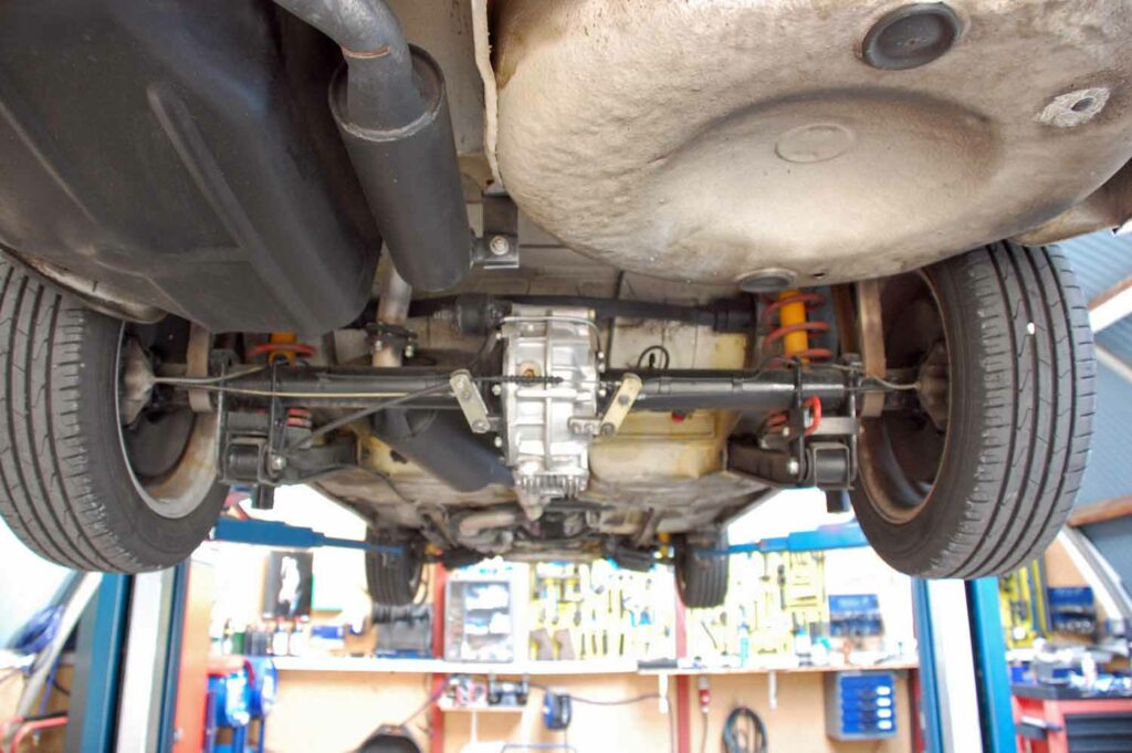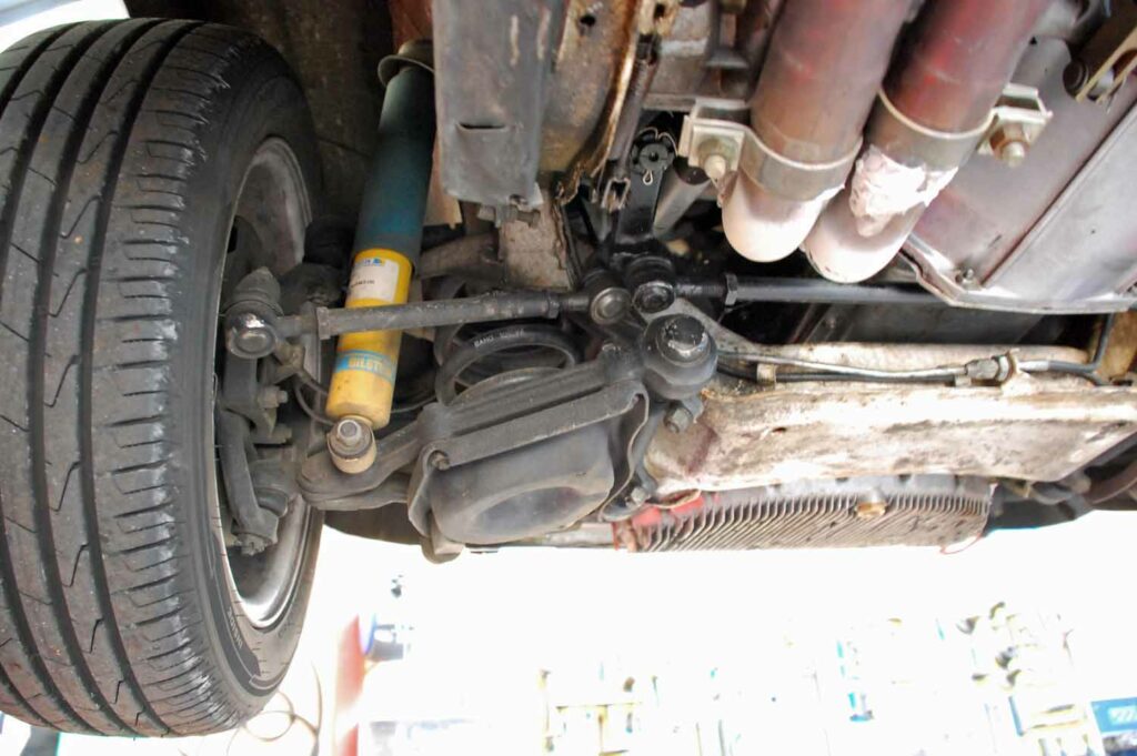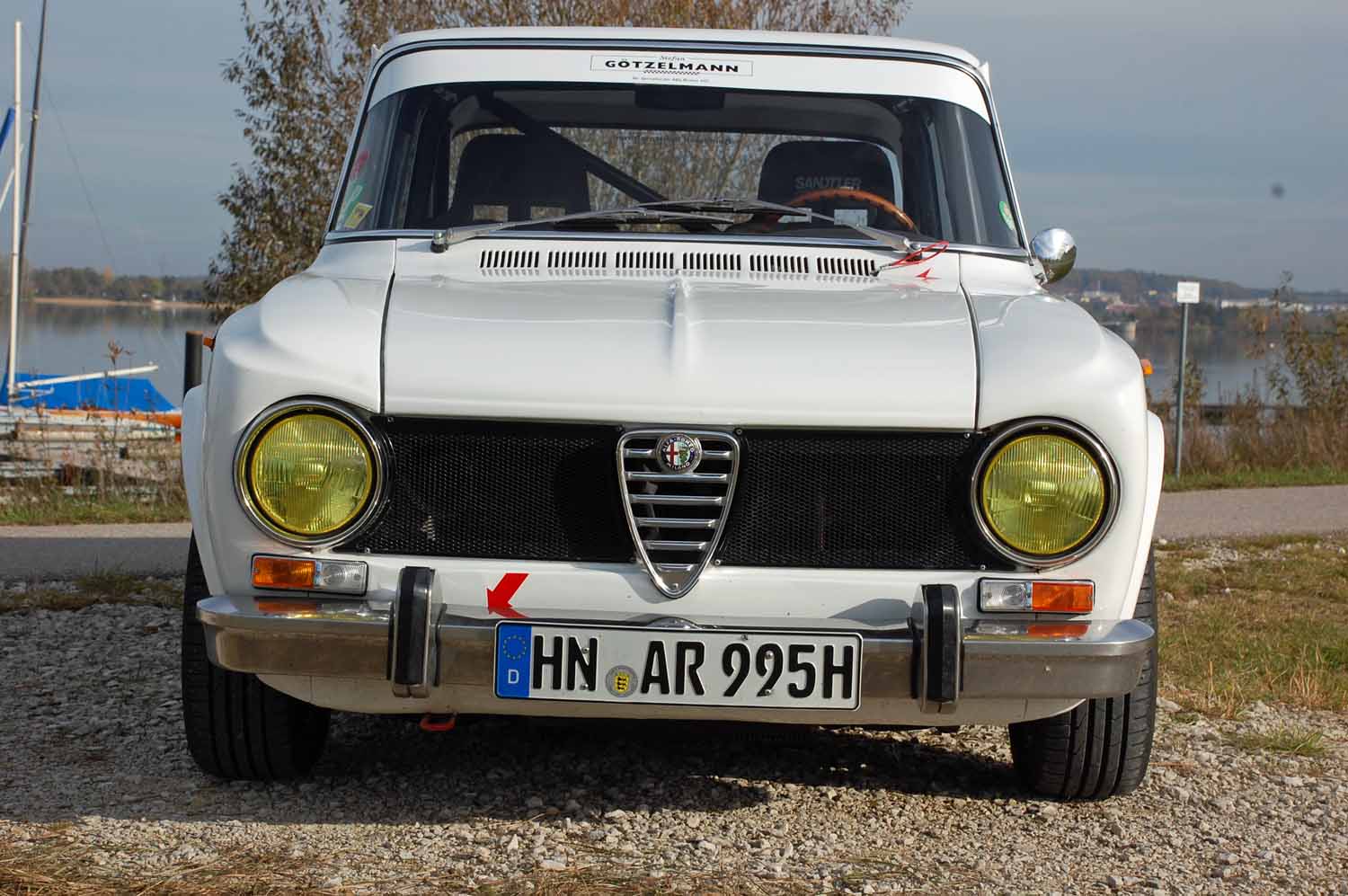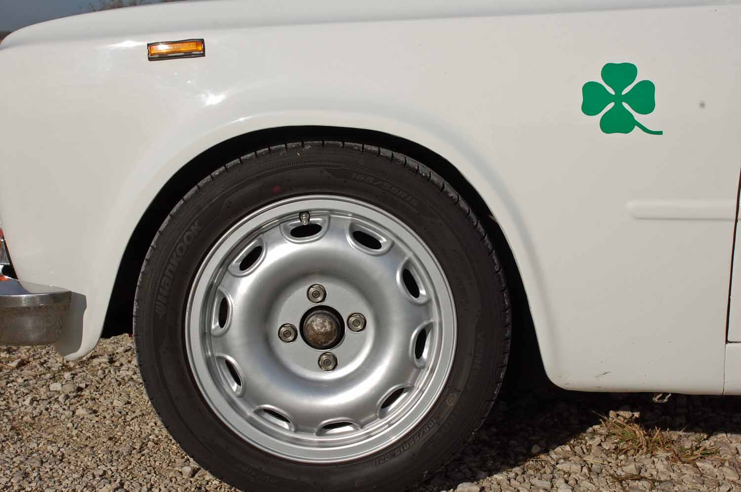 Die Giulia steht auf 15 Zoll Alu-Felgen im SZ-Design. Vorne sind verstellbare Querlenker eingebaut um den Sturz perfekt einstellen zu können. In Verbindung mit den Bilstein Dämpfern vorne, den Konis hinten und den Eibach Sportfedern hat der Alfa eine tolle Straßenlage.