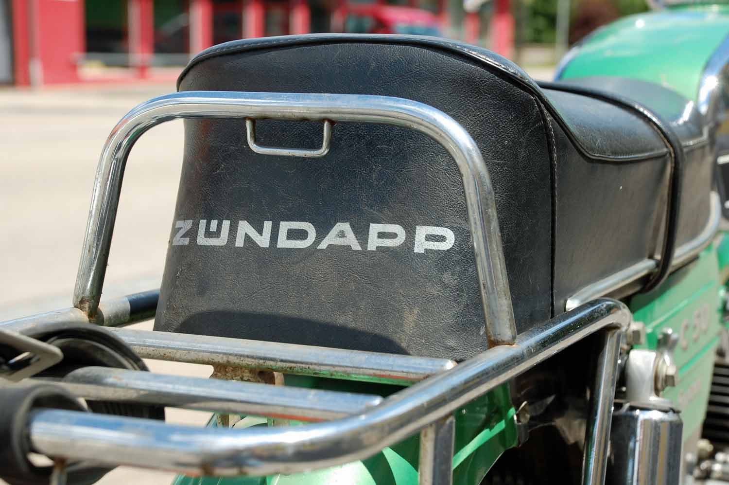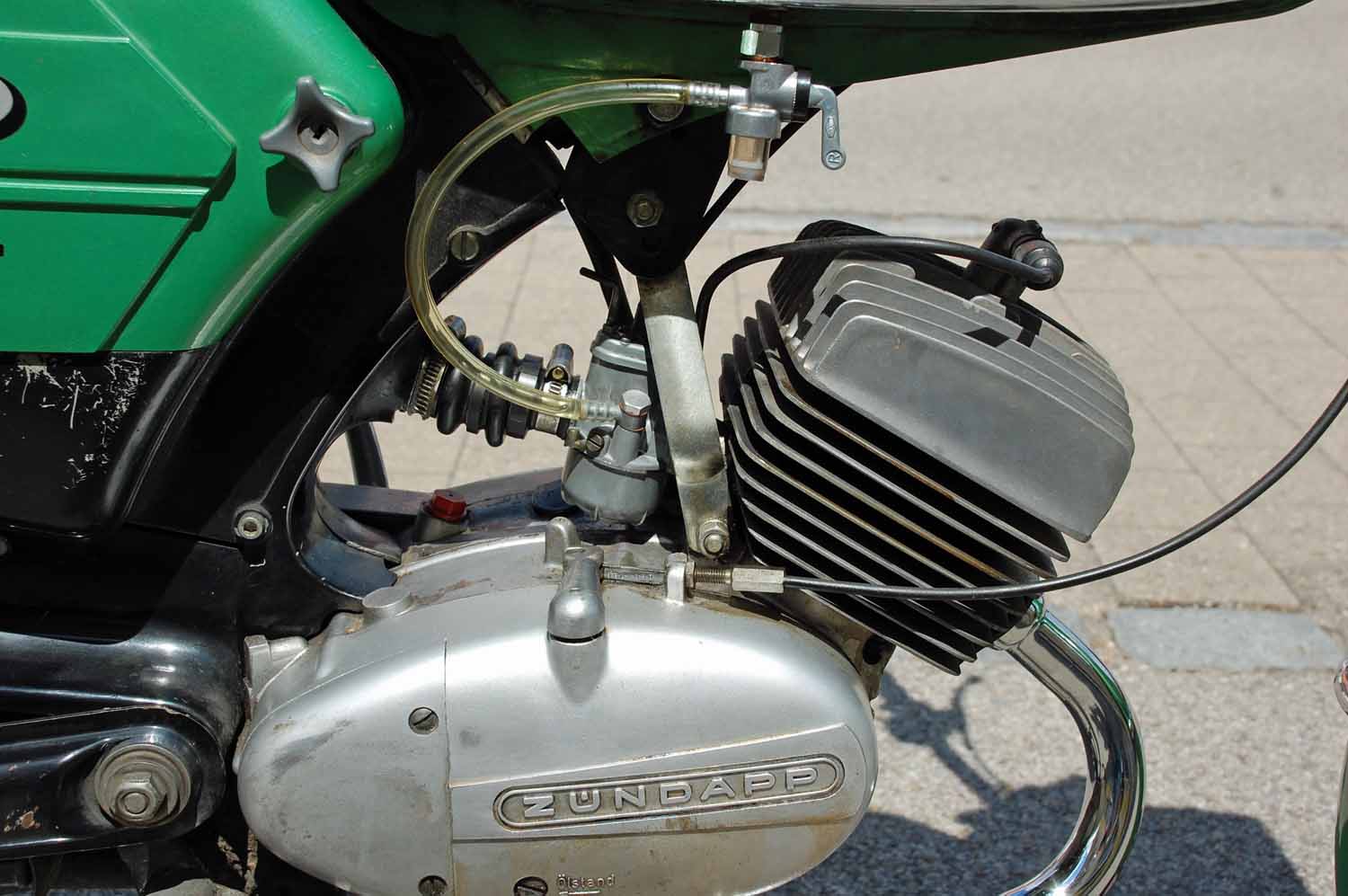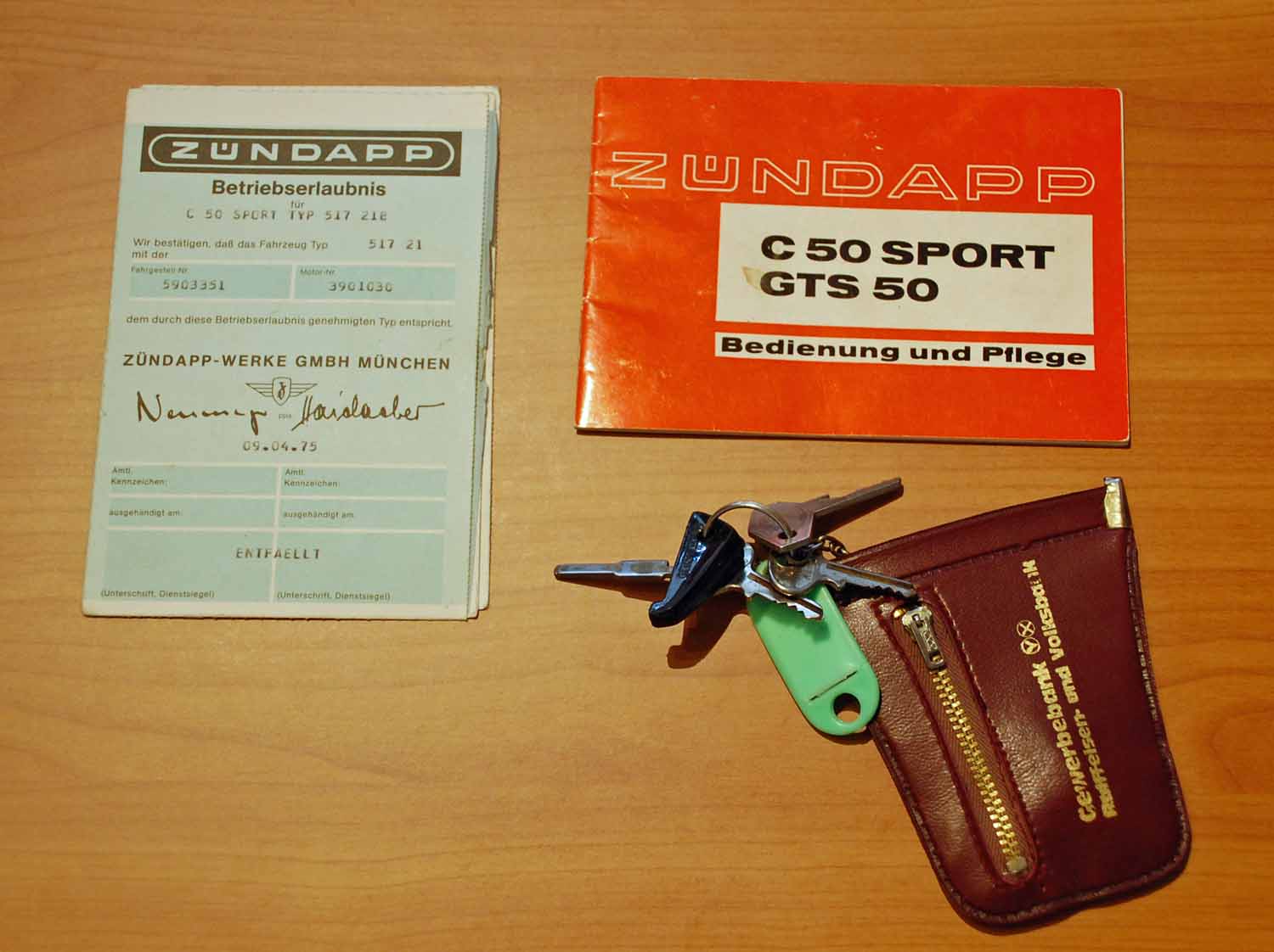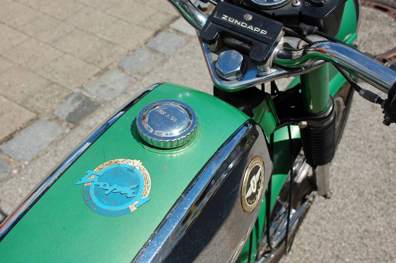 Bemerkenswert finde ich, dass die Zündapp weder nachlackiert noch sonst irgendwie optisch aufgehübscht wurde. Alles ist so wie sie aus dem Werk kam. Selbst die originale Luftpumpe und das Bordwerkzeug sind noch vorhanden. Auch die Bedienungsanleitung und die erste Betriebserlaubnis nebst dem Garantieschein sind noch da. Besonders witzig finde ich die Fahrradklingel, natürlich mit den Zündapp Flügeln in Chrom.
