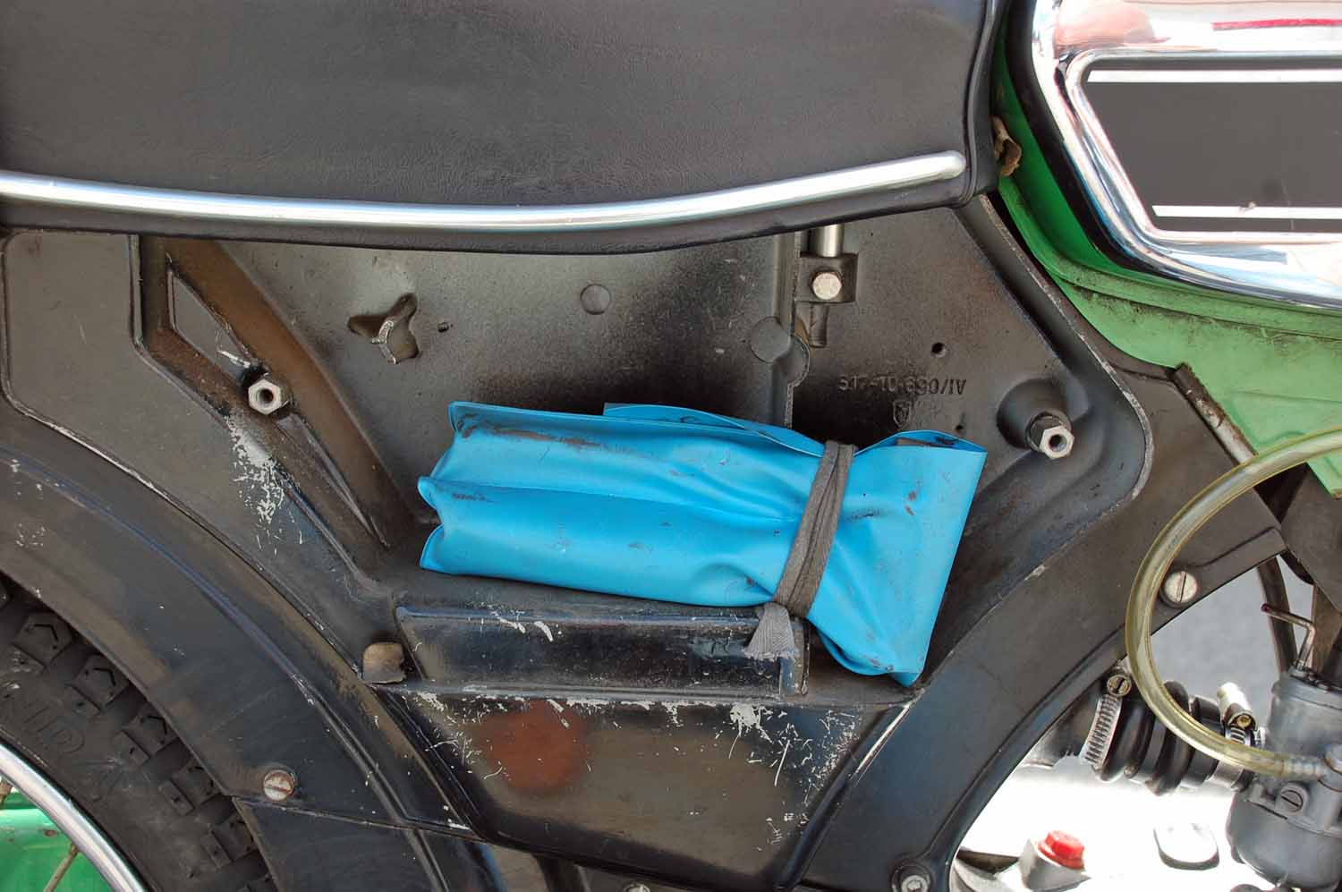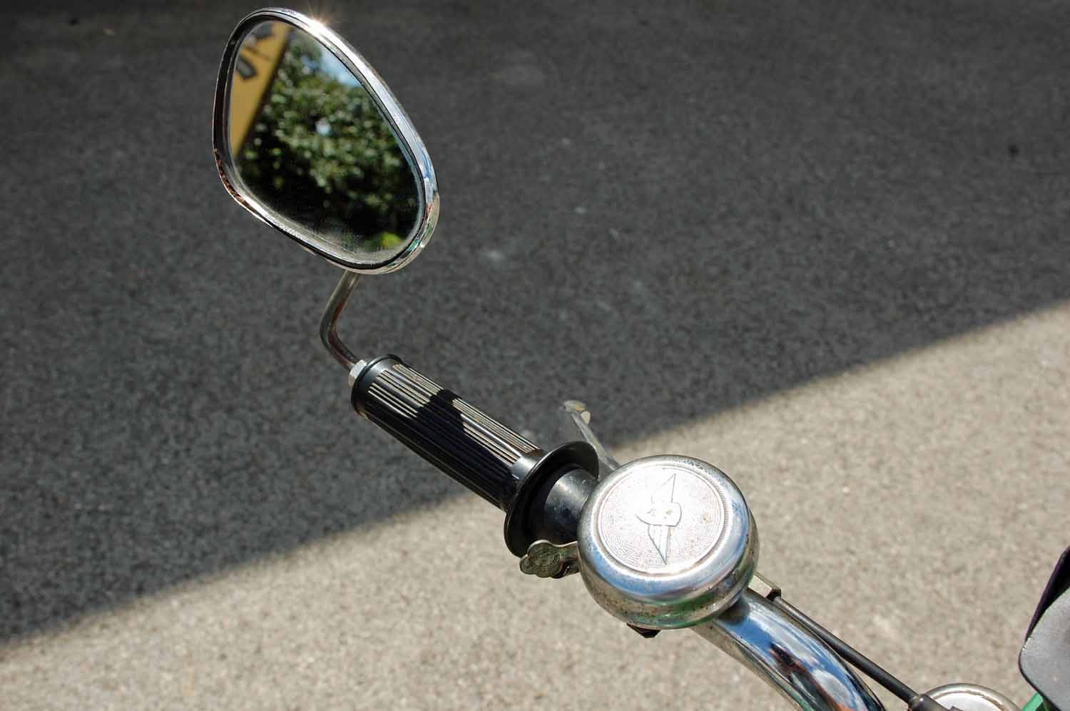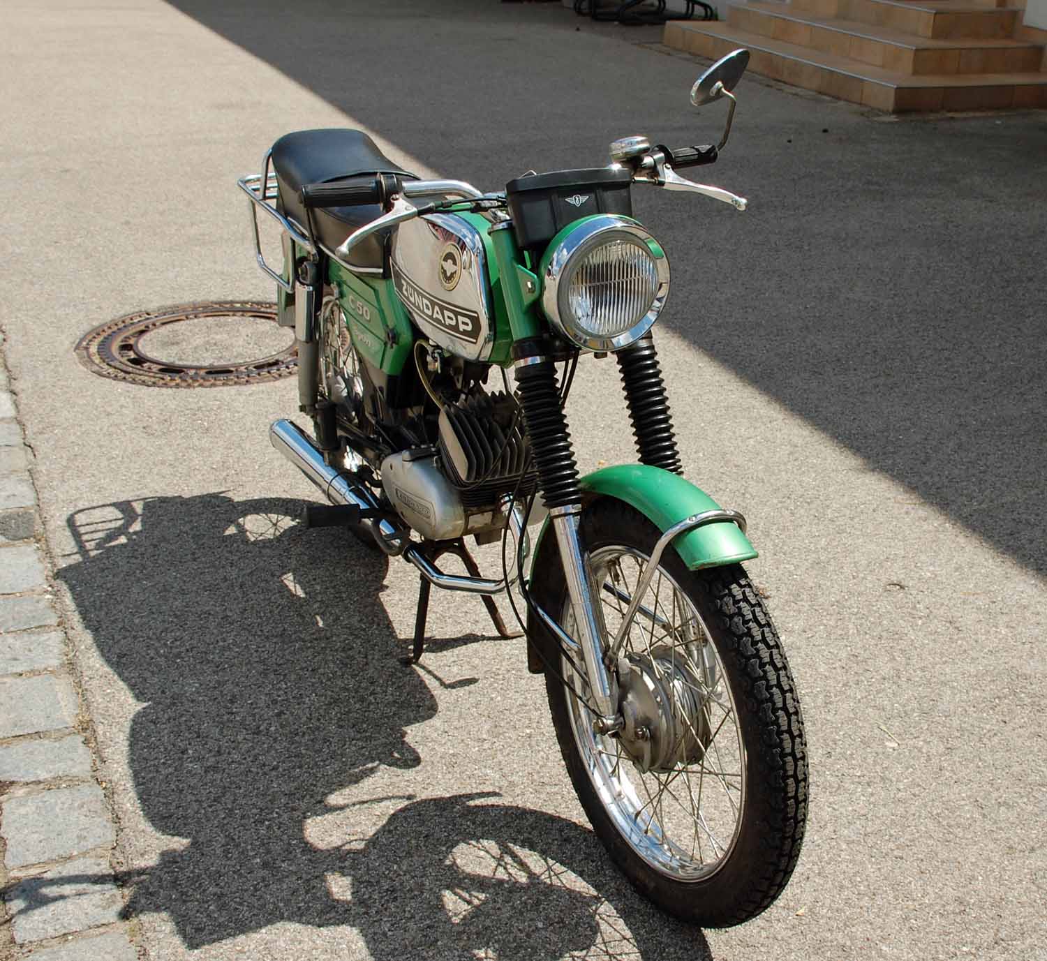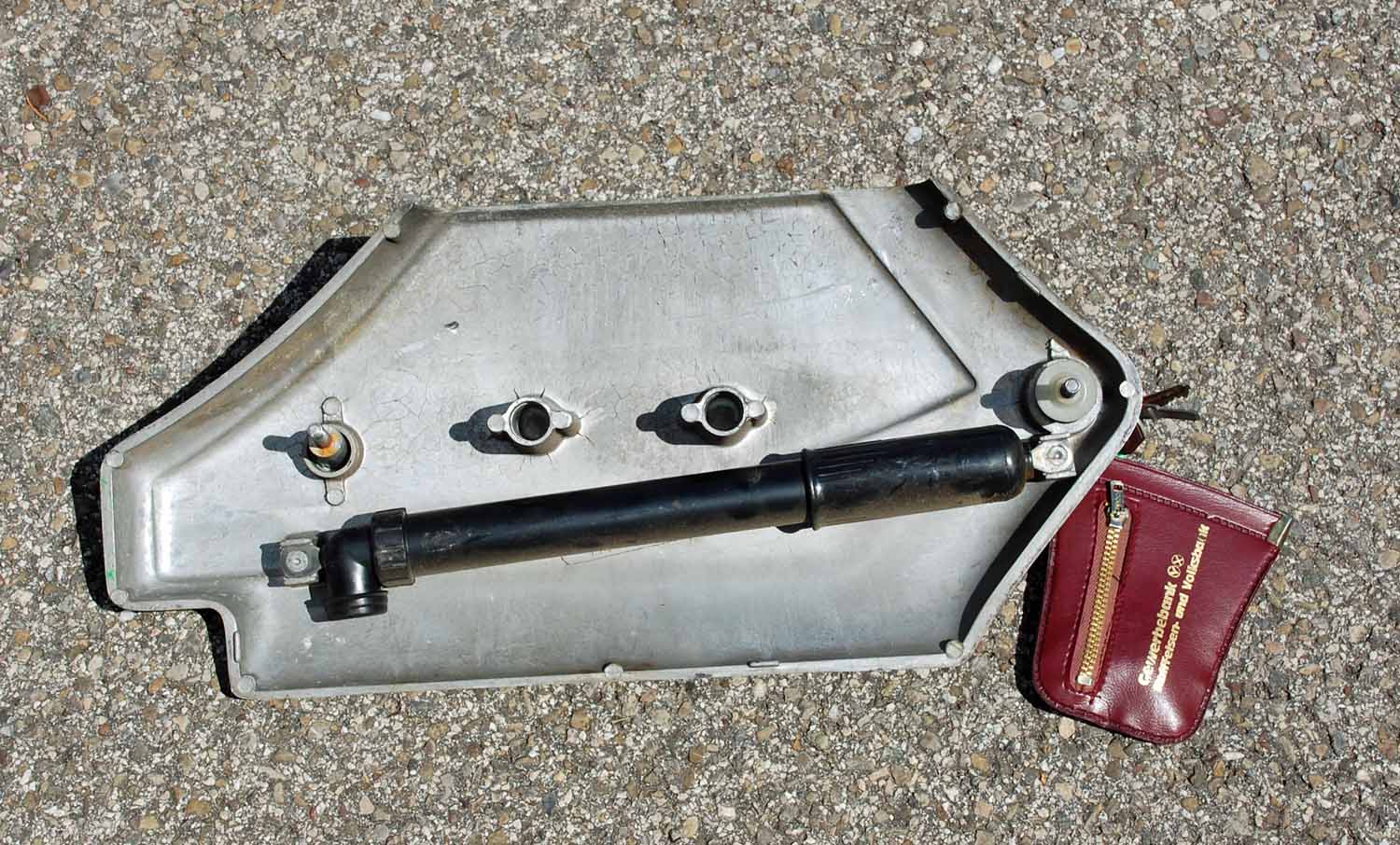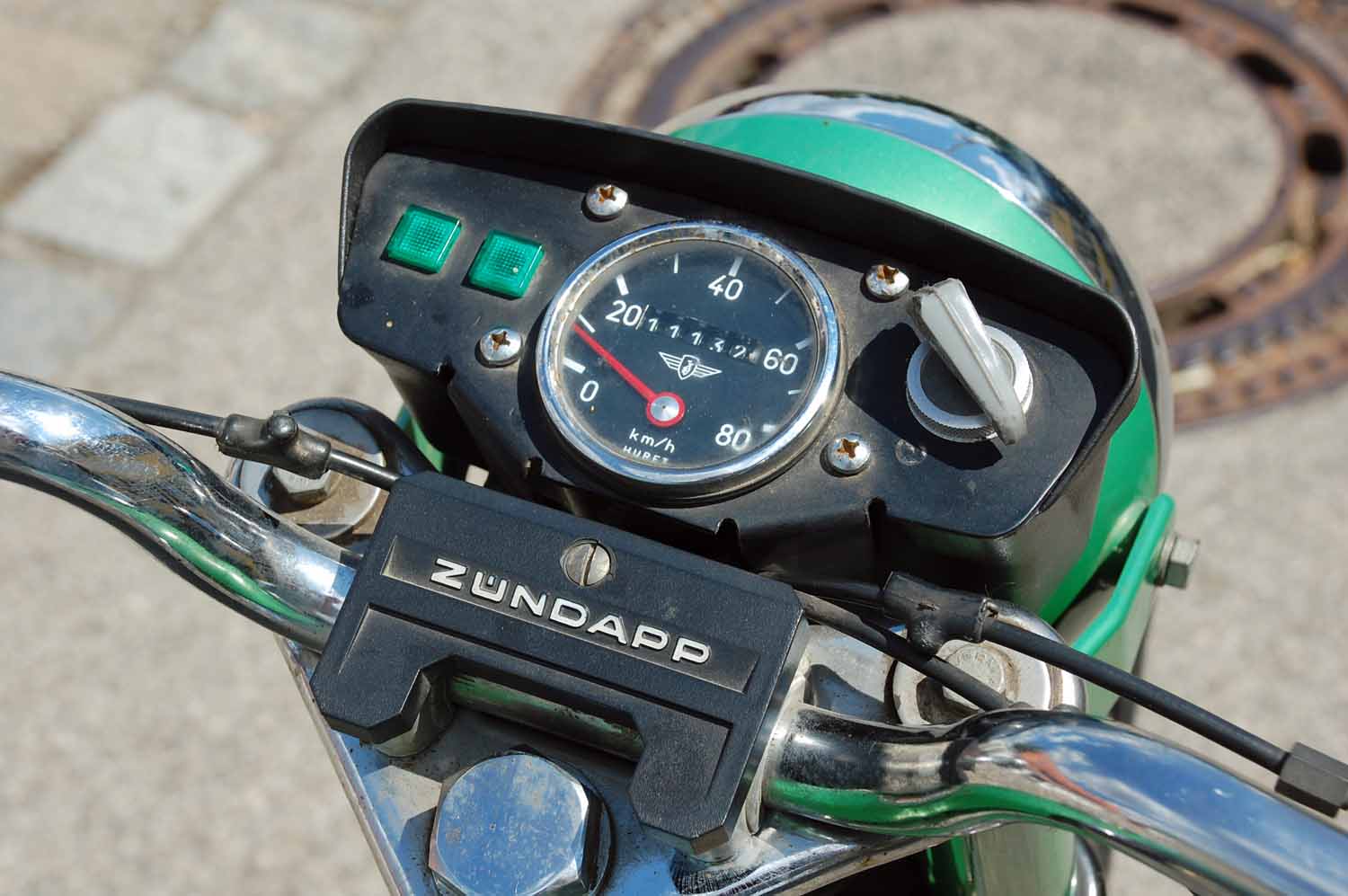Bemerkenswert finde ich, dass die Zündapp weder nachlackiert noch sonst irgendwie optisch aufgehübscht wurde. Alles ist so wie sie aus dem Werk kam. Selbst die originale Luftpumpe und das Bordwerkzeug sind noch vorhanden. Auch die Bedienungsanleitung und die erste Betriebserlaubnis nebst dem Garantieschein sind noch da. Besonders witzig finde ich die Fahrradklingel, natürlich mit den Zündapp Flügeln in Chrom.